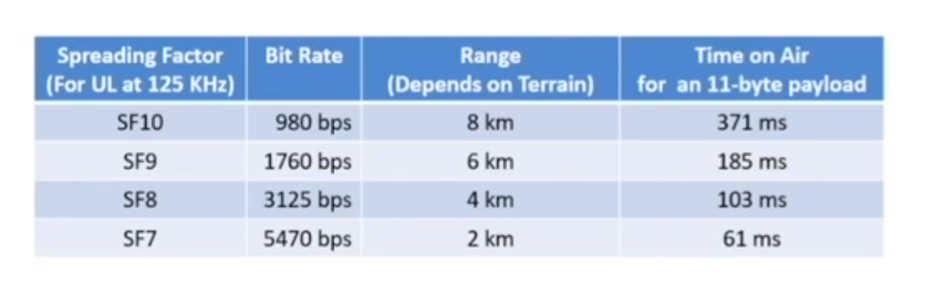 lower SF → Shorter range → less time on air → lower energy consumption → higher data rate